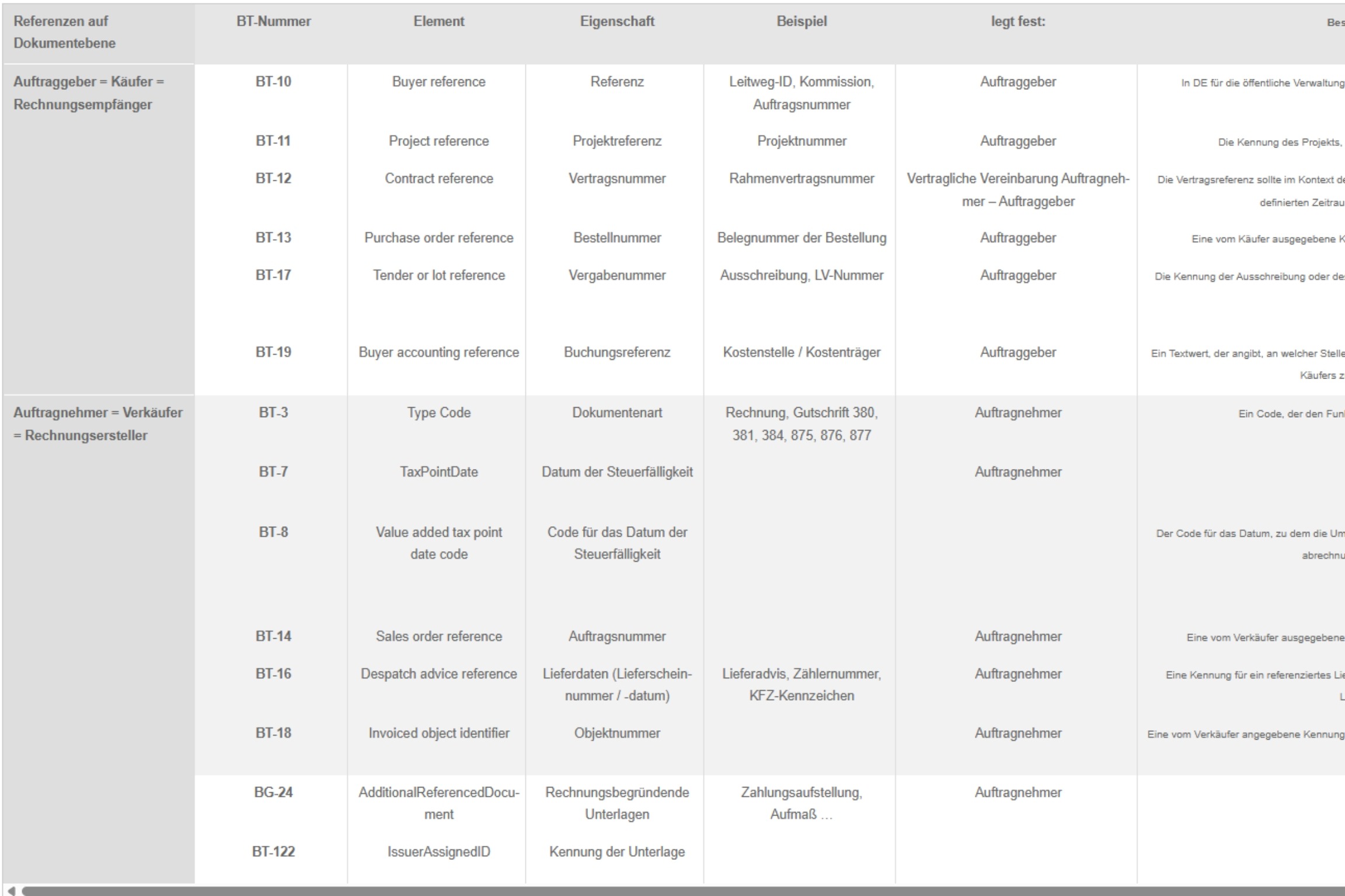 Die Arbeitsgruppe E‑Rechnung des BVBS Bundesverbands Software und Digitalisierung im Bauwesen e.V. hat deshalb eine praxisorientierte Empfehlung zur Nutzung der BT-Felder erarbeitet. Sie richtet sich an Anwender, IT-Entscheider, Fachabteilungen sowie Dienstleister, die an der technischen und organisatorischen Umsetzung beteiligt sind. Die Handlungsempfehlung fasst die für die Baubranche wesentlichen BT-Felder in einer Übersicht zusammen und schafft ein einheitliches Verständnis der relevanten Standards für Rechnungssender und Rechnungsempfänger. So wird die Interpretation und Anwendung der BT-Felder zu Auftrags-Referenzen vereinheitlicht – beispielsweise BT-13 (Bestellnummer), BT-14 (Auftragsnummer), BT-10 (Buyer Reference) und BT-11 (Projektnummer).
