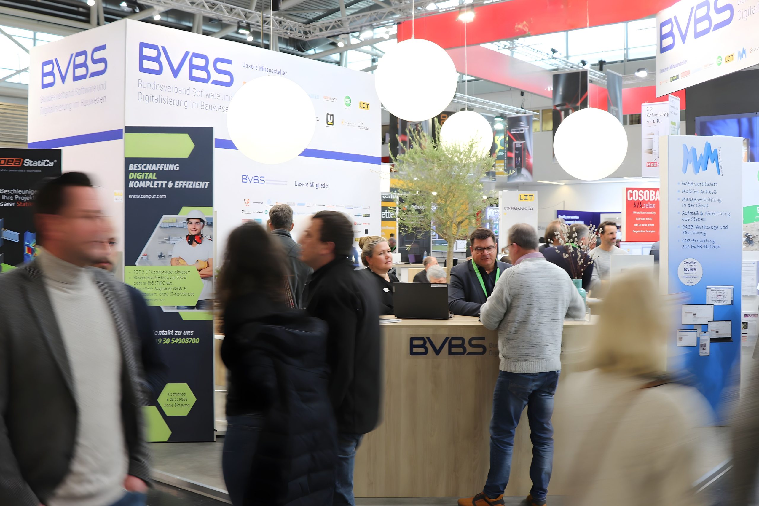 Mit sei­nem Gemein­schafts­stand bie­tet der BVBS eine unab­hän­gi­ge Platt­form für den akti­ven fach­li­chen Aus­tausch von Bran­chen­ak­teu­ren sowie poli­ti­schen und wirt­schaft­li­chen Inter­es­sen­ver­tre­tern. Im Vor­der­grund steht die Aus­ein­an­der­set­zung mit den aktu­el­len The­men der digi­ta­len Trans­for­ma­ti­on im Bau­we­sen und das Knüp­fen wert­vol­ler Kon­tak­te. Ins­ge­samt prä­sen­tie­ren 14 Mit­glieds­un­ter­neh­men aus ver­schie­de­nen Sek­to­ren der Bau­wirt­schaft ihre Soft­ware­lö­sun­gen auf dem BVBS-Gemeinschaftsstand: